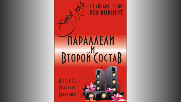 23-го января состоится рок-концерт в ДК.Начало в 18:00.Стоимость билета: 50 рублей.Участники: "Параллели" и "Второй Состав".Продолжительность: 1,5 - 2 часа.Информация окончательная и обжалованию не подлежит.Ждем всех, будет музыка.Только живой звук.