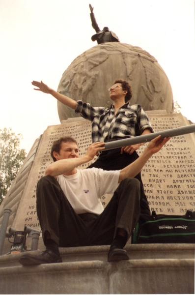 вдвоём были мы, фотик зенит, стоит на земле - подержать некому.год 2001й вроде. кружка слева свежеукраденная из какой-то забегаловки. тяжелющее было раковина на подставке :)