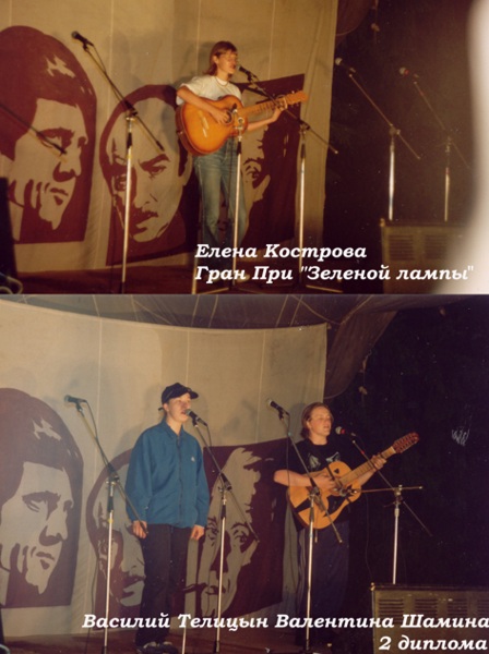 Фестиваль имени Минина, в простанодье Зеленка (п. Антоновск под Н. Тагилом) состоялся и совсем неплохо для Качканара, Елена Кострова со своей песней сорвала главный приз фестиваля (Гран При). Надо упомянуть что на Грушинском Елена Кострова дошла до 3 тура среди взрослых, а это 1 шаг от призовых мест. Василий Телицын с Валей Шаминой на пару сорвали 2 диплома также с авторской песней, на рок сцене и в акции радио "Шансон". Народу фестиваль собирает все больше, хотя бардов на мой взгляд не так уж и прибавляется :) Байкеры, кришнаиты, Металеры и рокеры всех мастей и оттенков. Самое интересное что в этой "драчливой братии" (ну мнение у народа такое :)) не возникло сильных каких конфликтов, все было тихо мирно. :) Дождь не портил настроение, теплая как молоко речка, не особо холодные ночи, что еще надо для людей которые любят гитару и палаточный образ жизни.. Ларечники и шашлычники умудрялись разживаться даже там, в основном благодаря мужикам с пузом и на мерсах. Простой народ хапал "Галину Бланку" и "Доширак" с "нажористыми химикалиями" ну не обошлось без пива ящиками :) P.S На фото победители :)