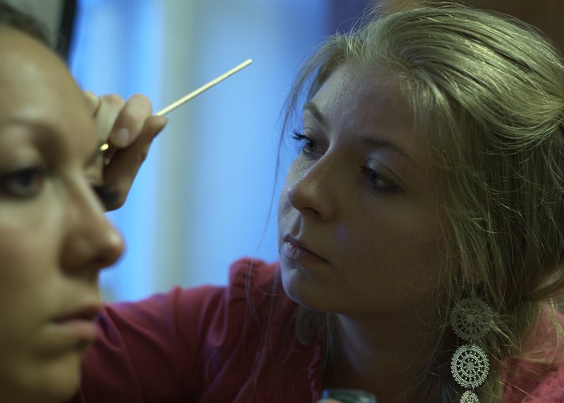несоответствие немножко в планах, первый выпадает немного, как-будто вклеили после съемки, и направление взгляда художника мимо ощущается.