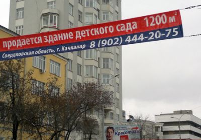 В Екатеринбурге, на улице 8 Марта, появилось объявление о продаже здания детского сада в Качканаре. Рекламная растяжка размещена около здания правительства Свердловской области, недалеко от перекрестка с переулком Химиков, и зданий правительства, аппарата ГФИ и Заксобрания Свердловской области, сообщает Накануне.RU . В объявлении был указан телефон, на том конце провода ответила девушка, представившись Юлией и непосредственным владельцем этого здания.