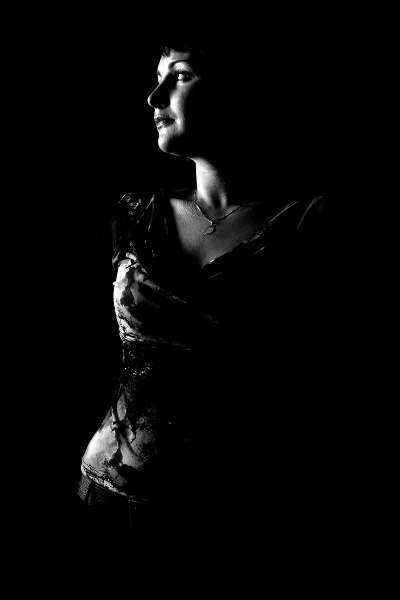 Бросается в глаза чёрно-провальный треугольник носа. Может тогда уже полный профиль? Или же в три четверти? Отражатель, я думаю, не испортил бы эфектное освещение. А в целом нравится.
