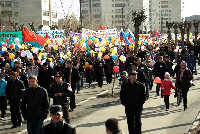 Чтобы это значил контраст между флажково-шариковой пестротой и угрюмо-отрешённым выражением лиц участников демонстрации??? Только одну улыбку разглядела.